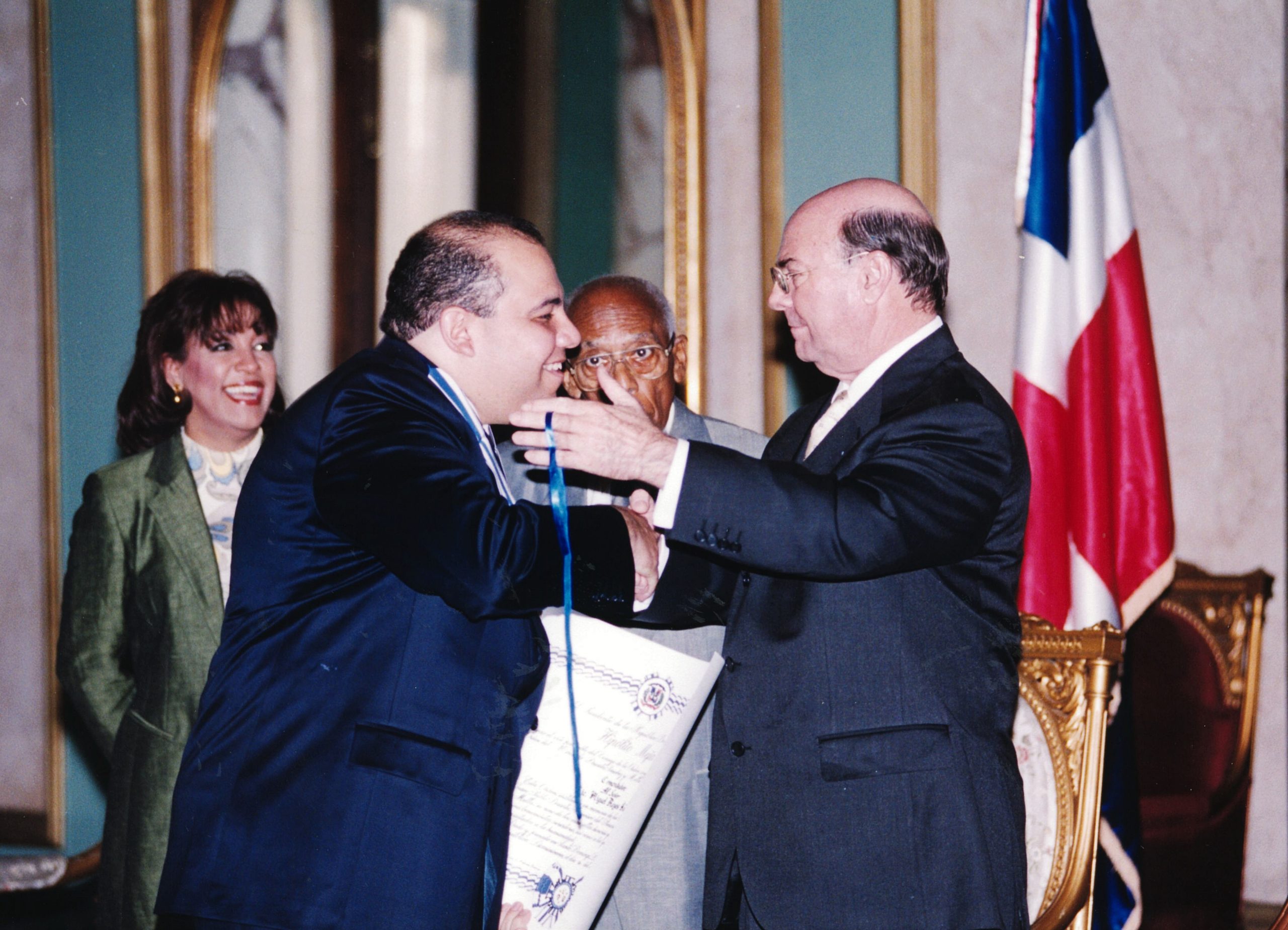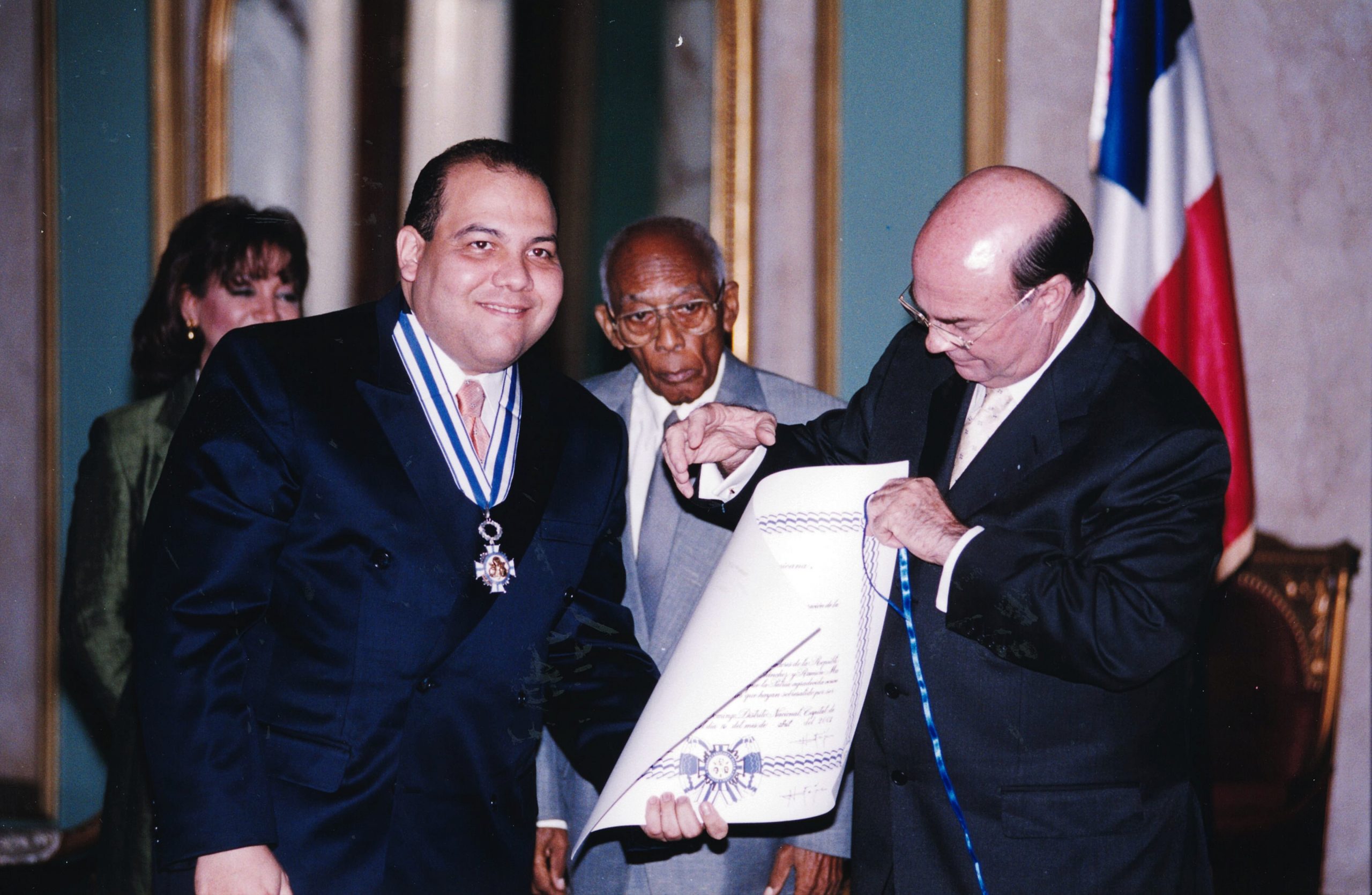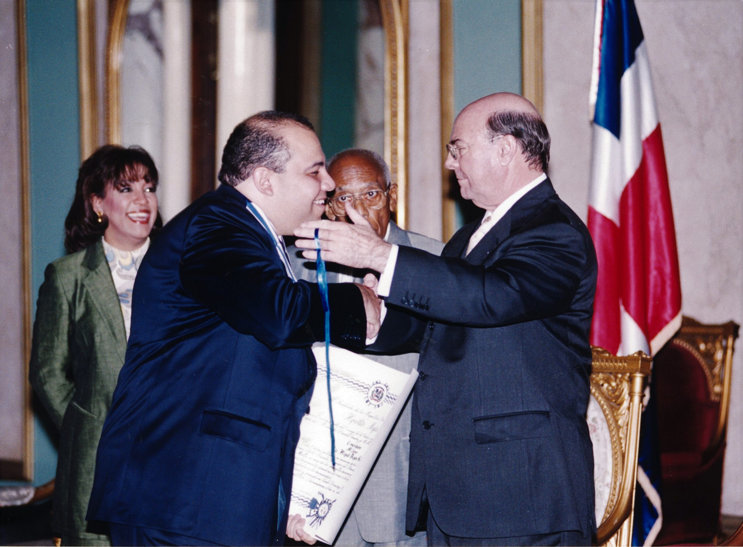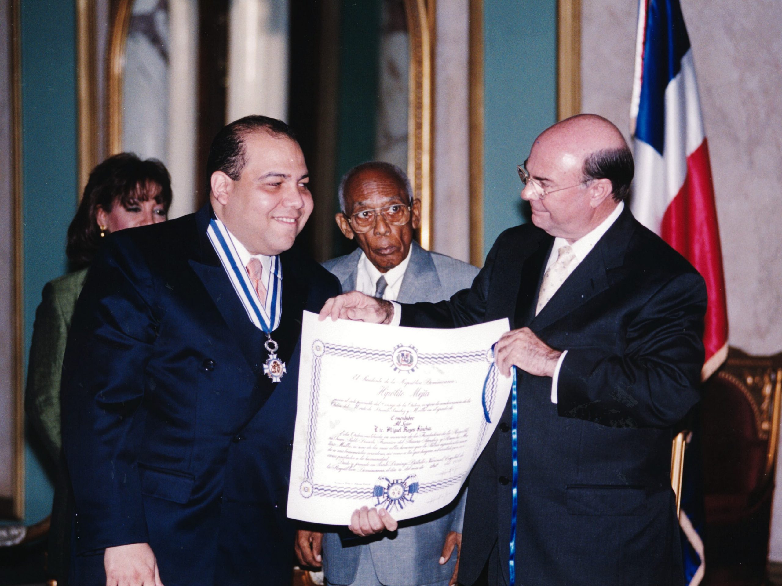 Momento de la condecoración: Miguel Reyes Sánchez, el Presidente Hipólito Mejía Y Carlos Guzmán, Jefe de Protocolo