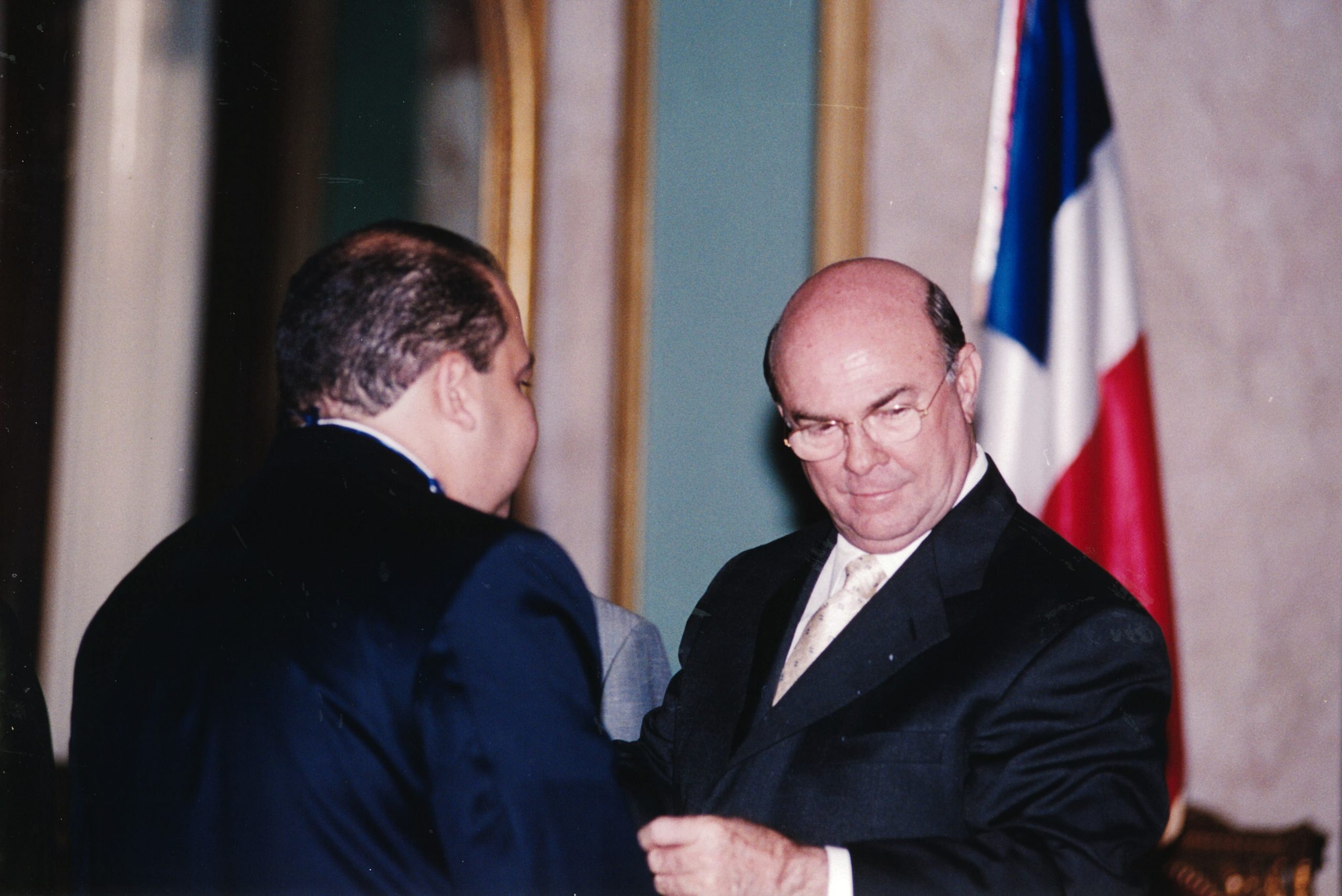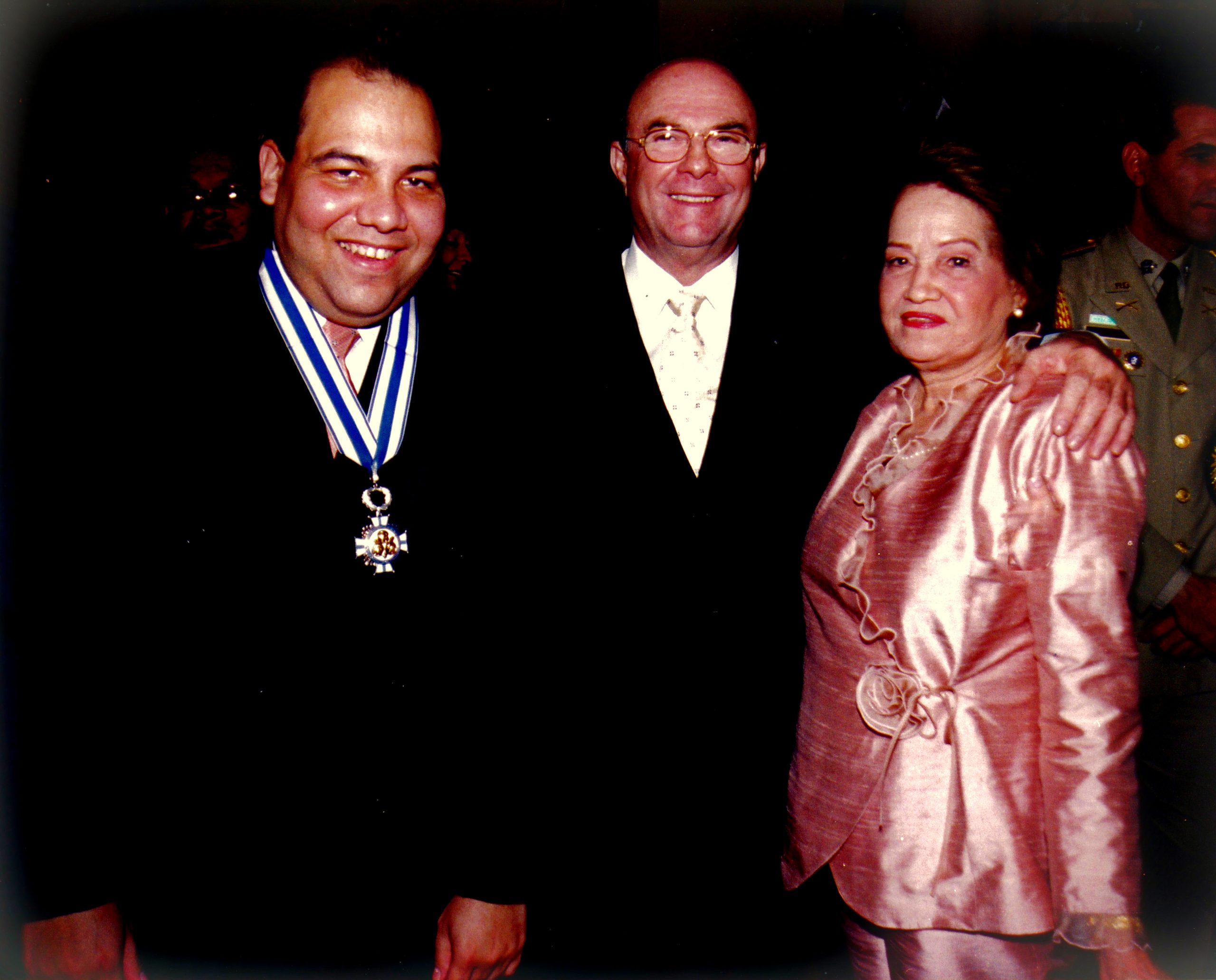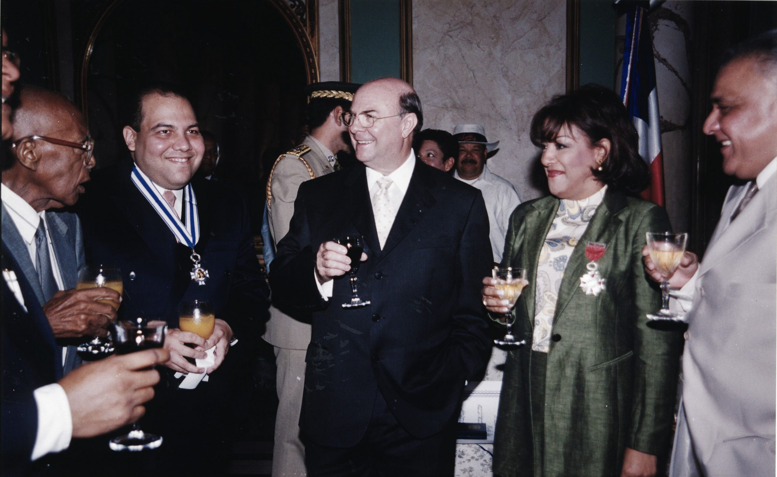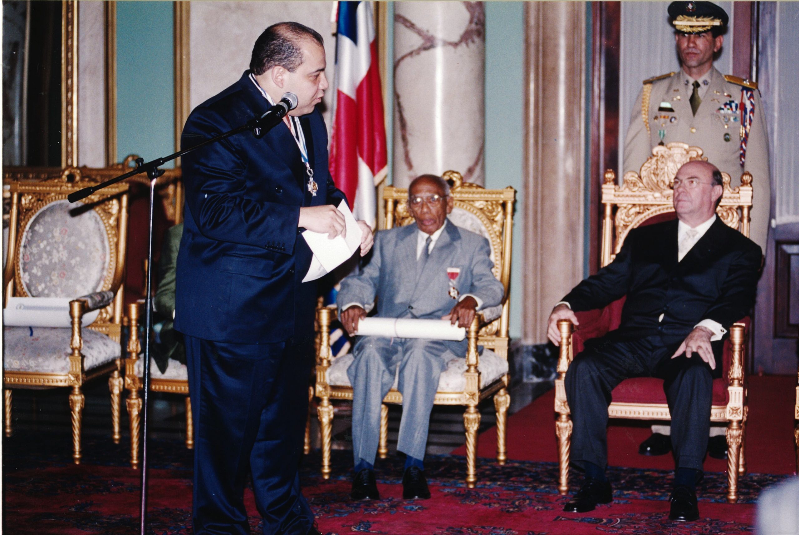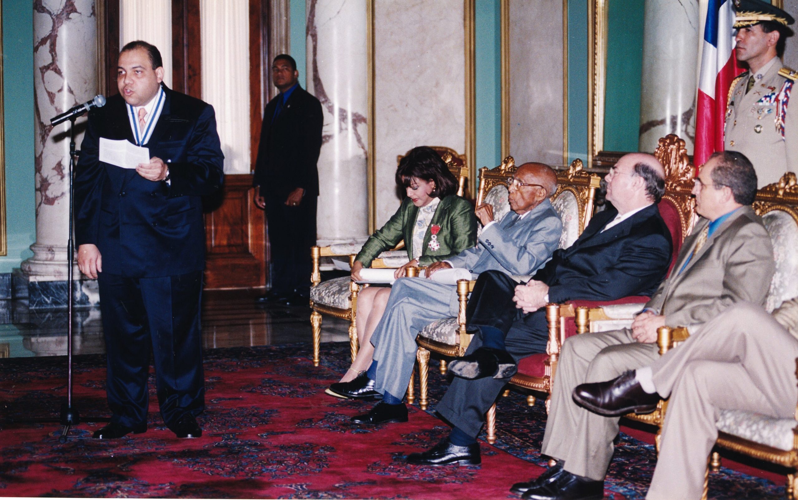 Momento de la condecoración: Miguel Reyes Sánchez, el Presidente Hipólito Mejía Y Carlos Guzmán, Jefe de Protocolo