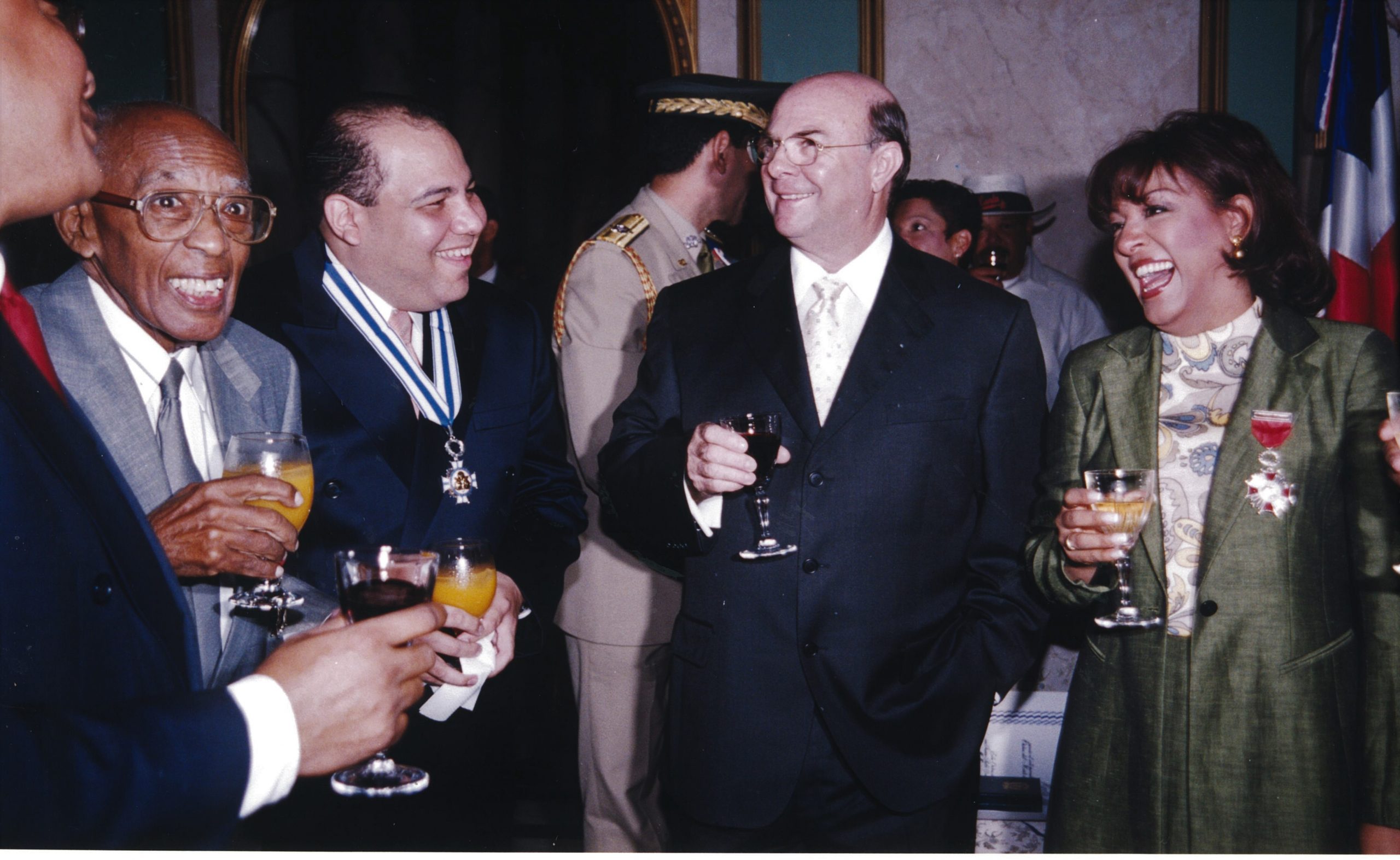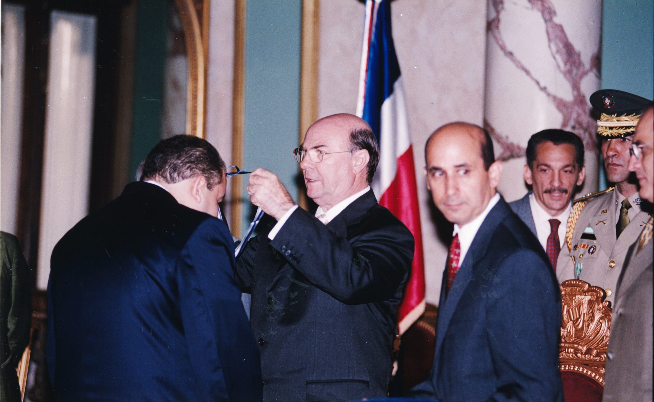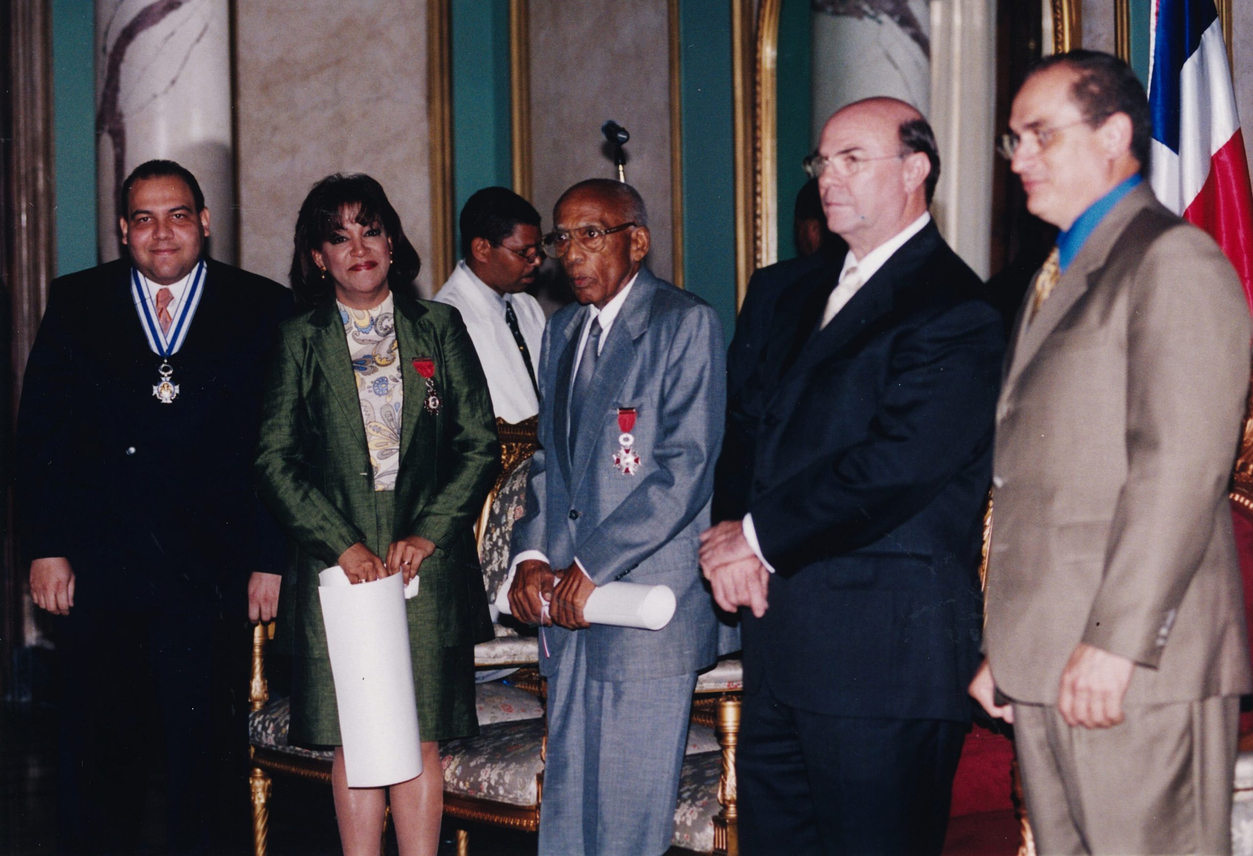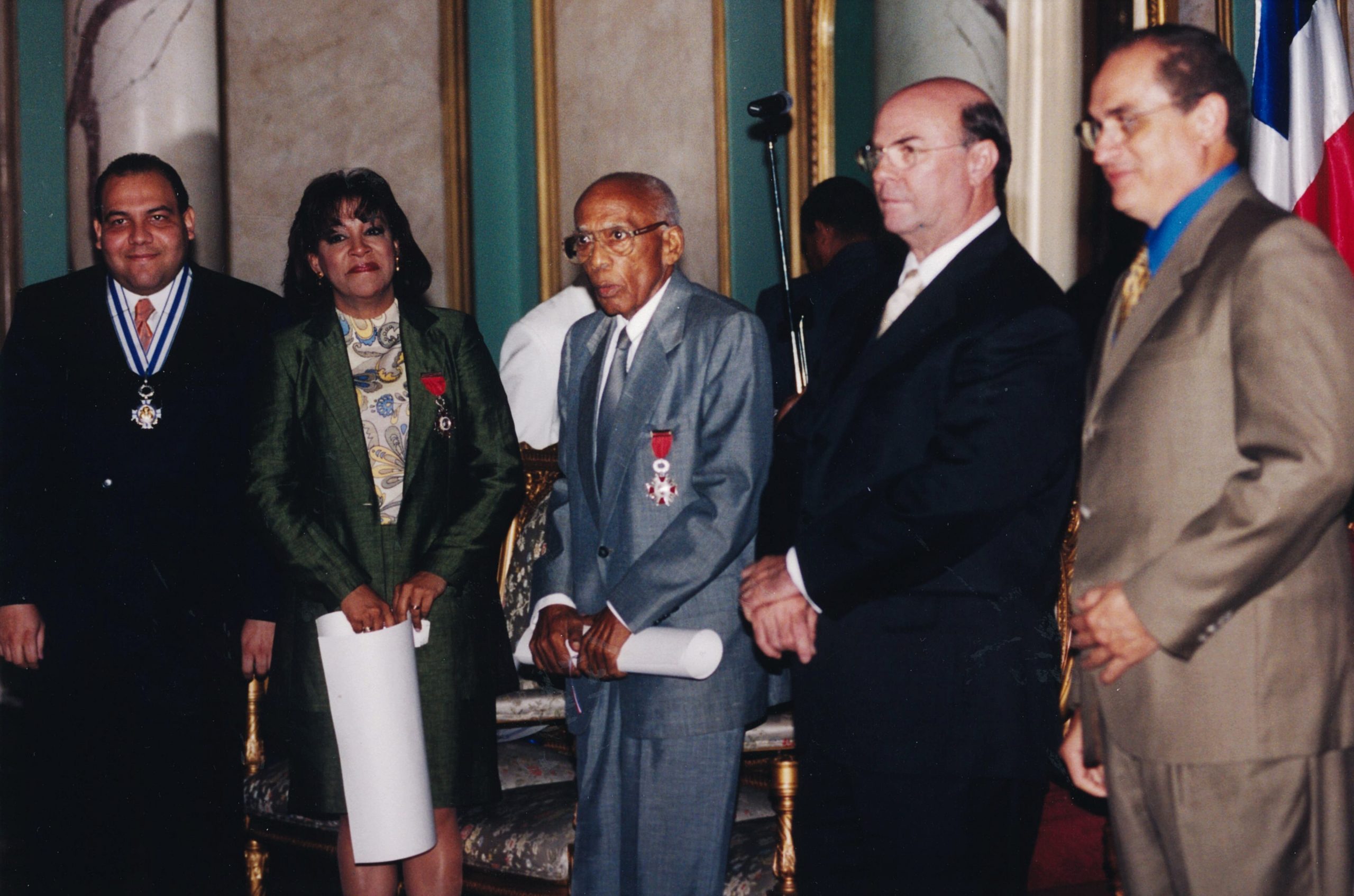 Momento de la condecoración: Miguel Reyes Sánchez, el Presidente Hipólito Mejía Y Carlos Guzmán, Jefe de Protocolo