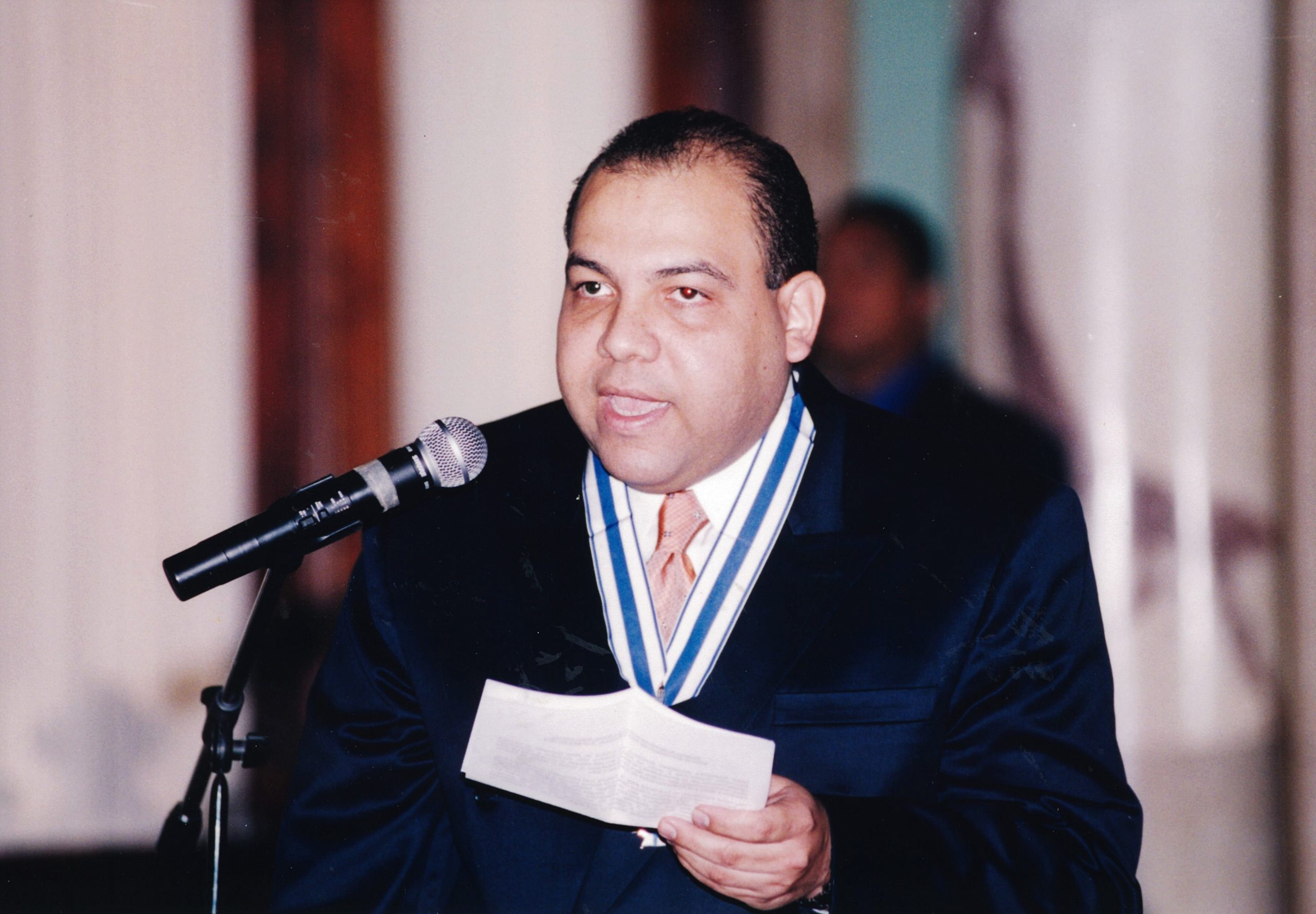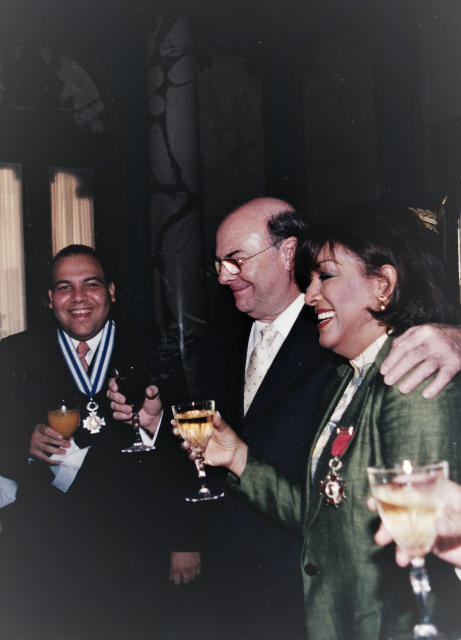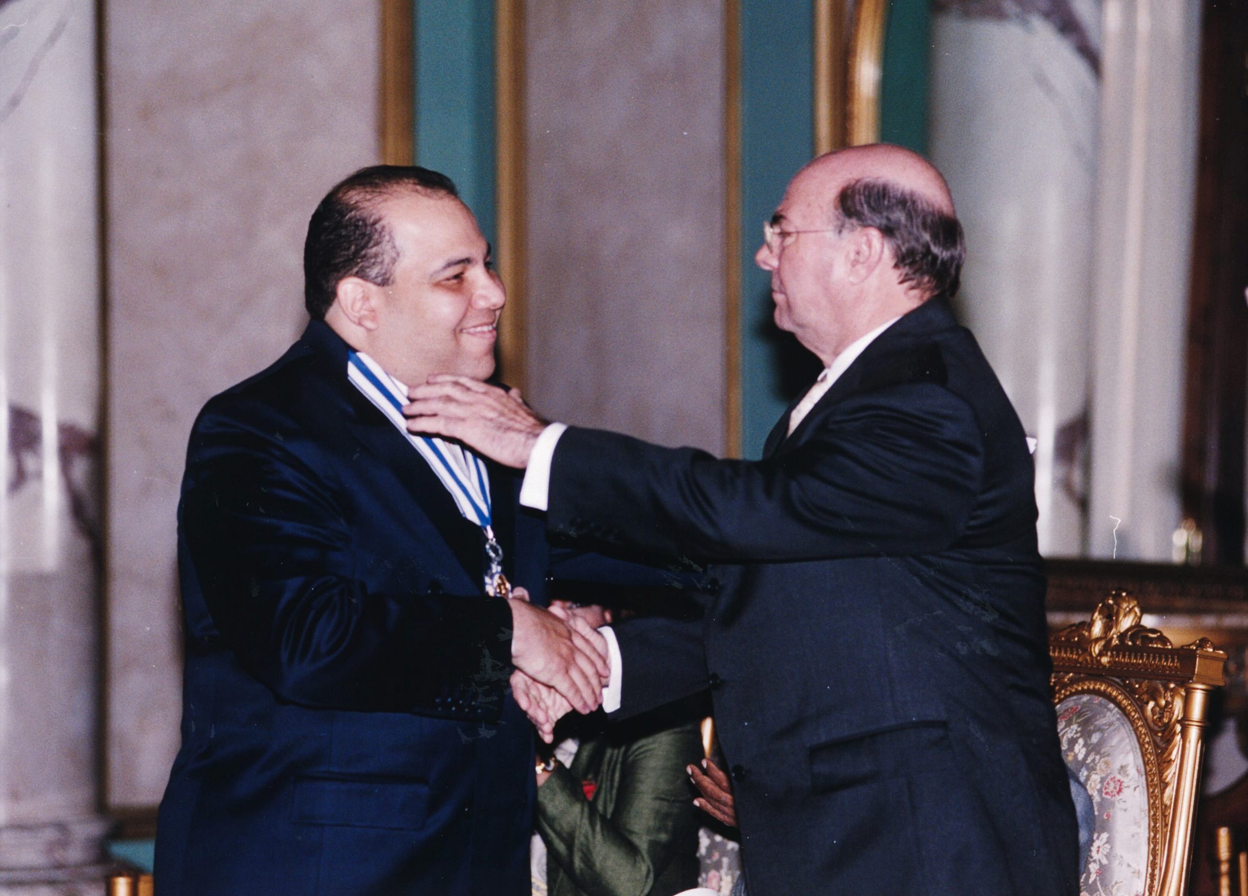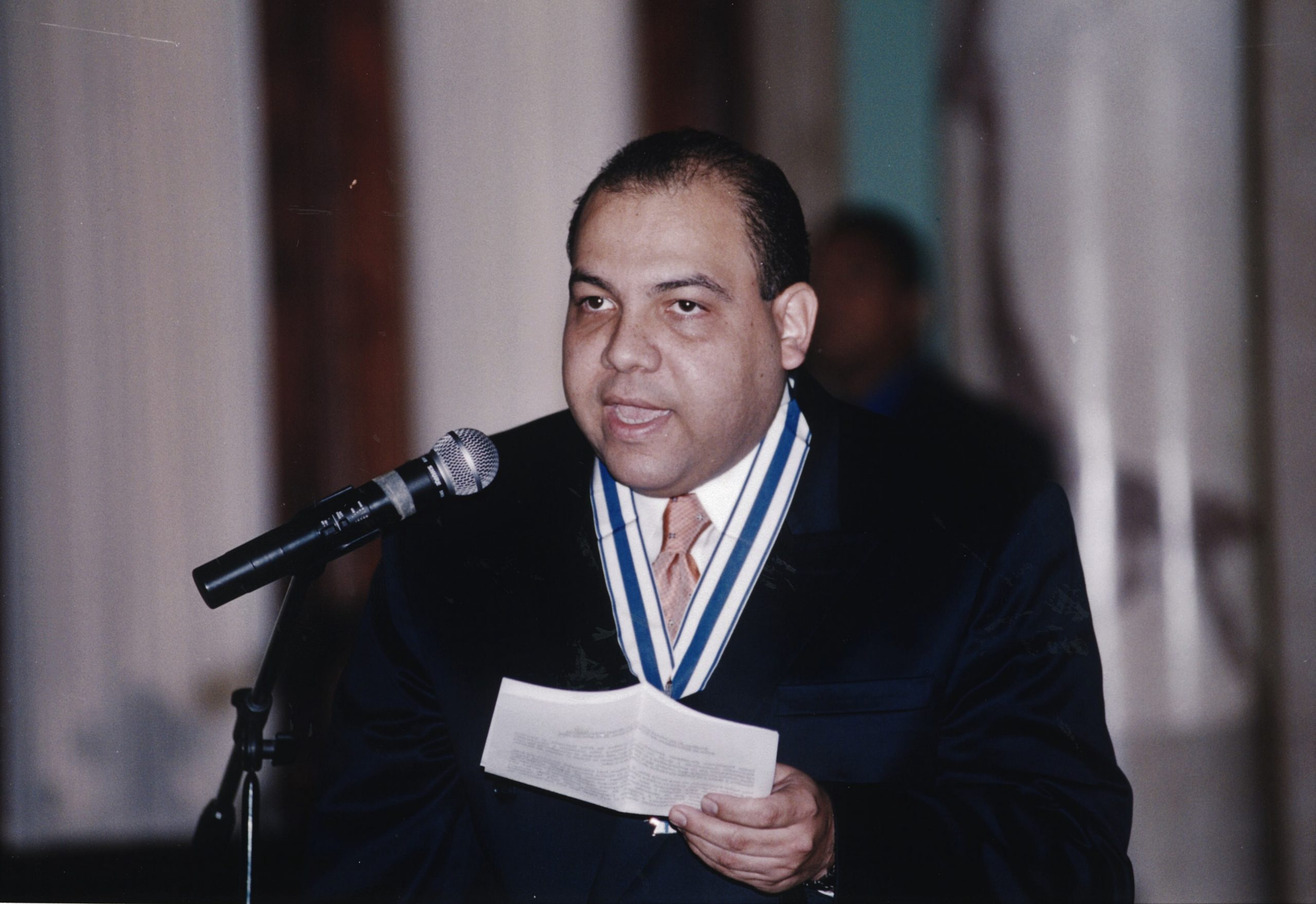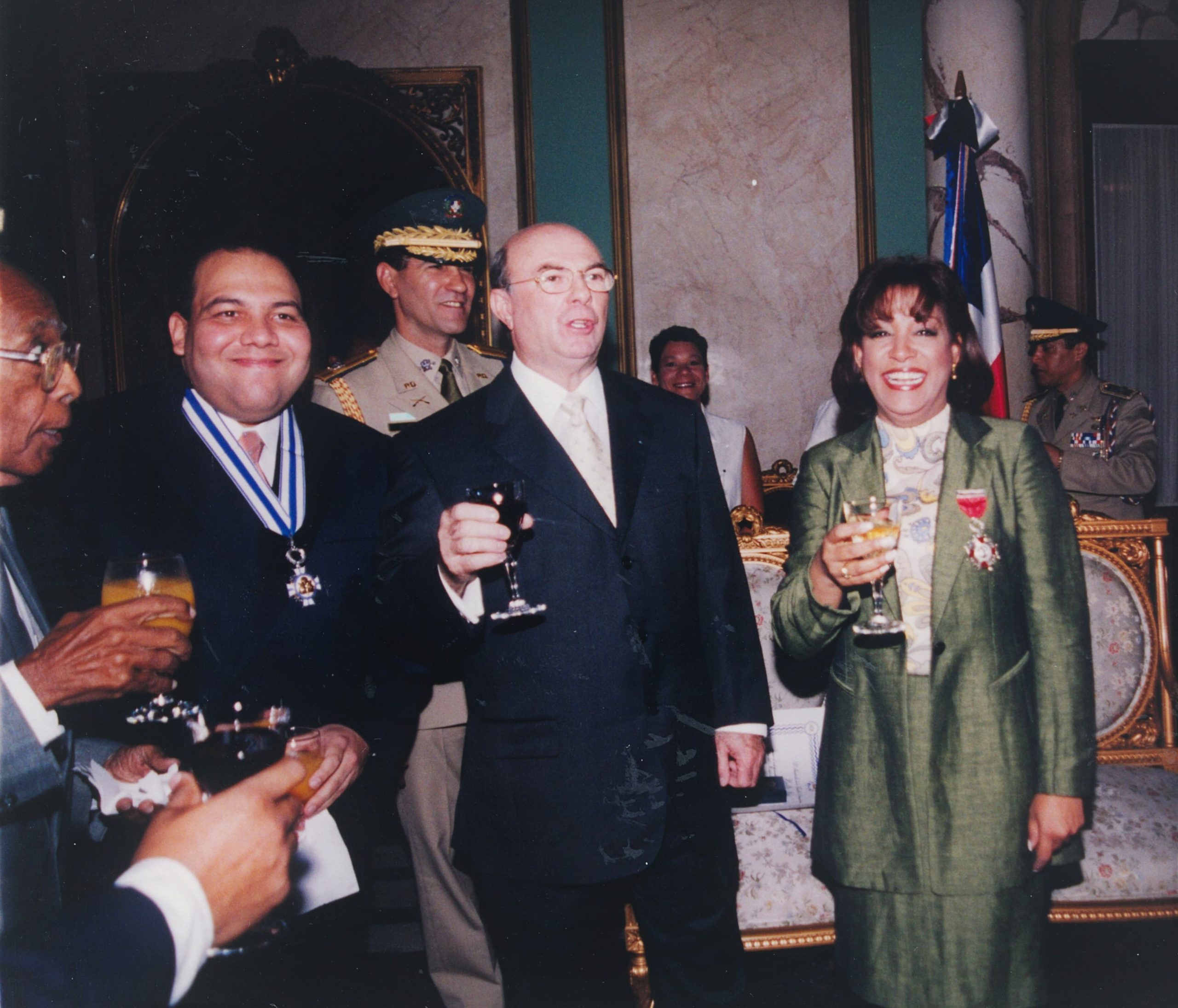 Momento de la condecoración: Miguel Reyes Sánchez, el Presidente Hipólito Mejía Y Carlos Guzmán, Jefe de Protocolo
