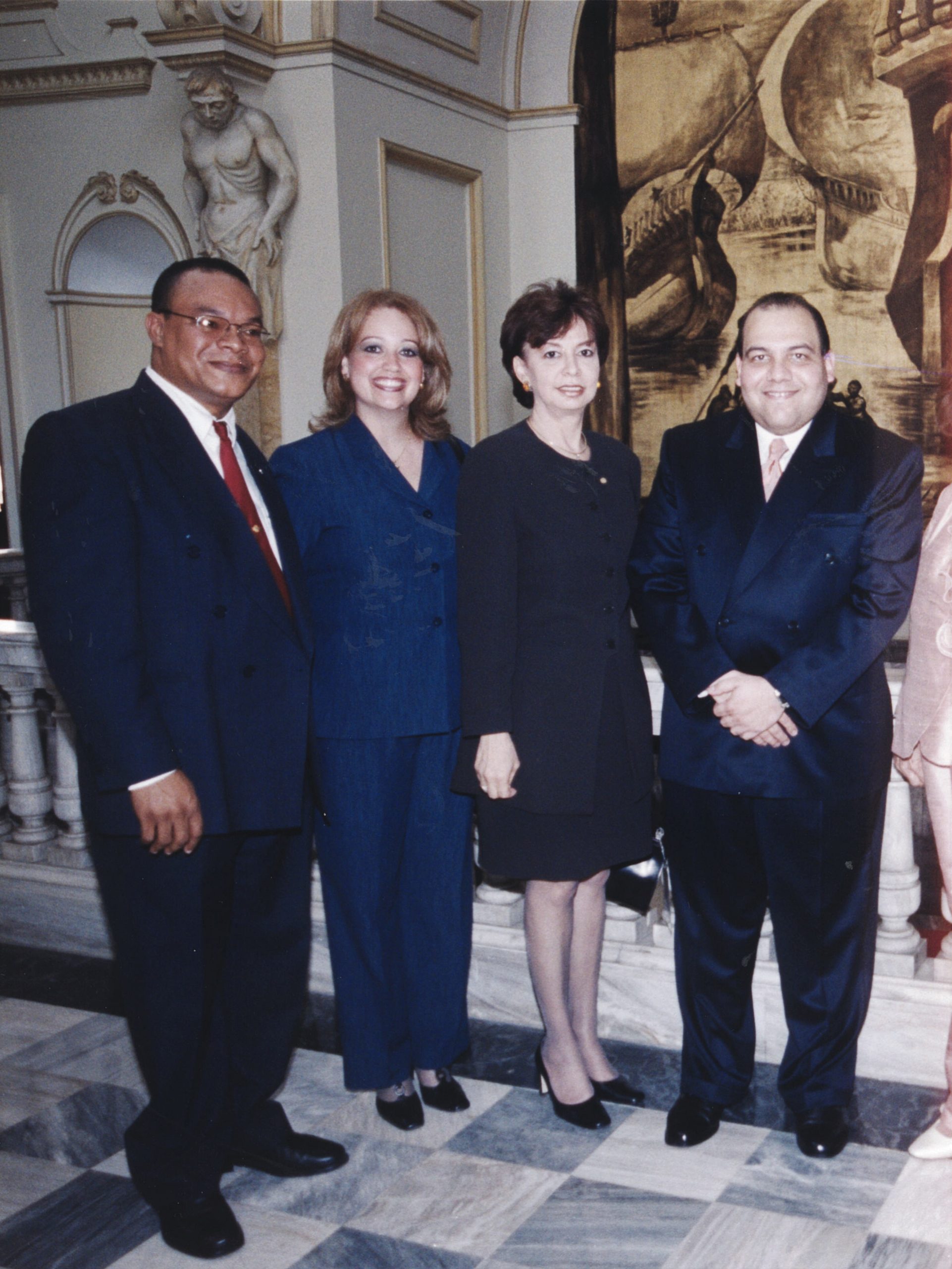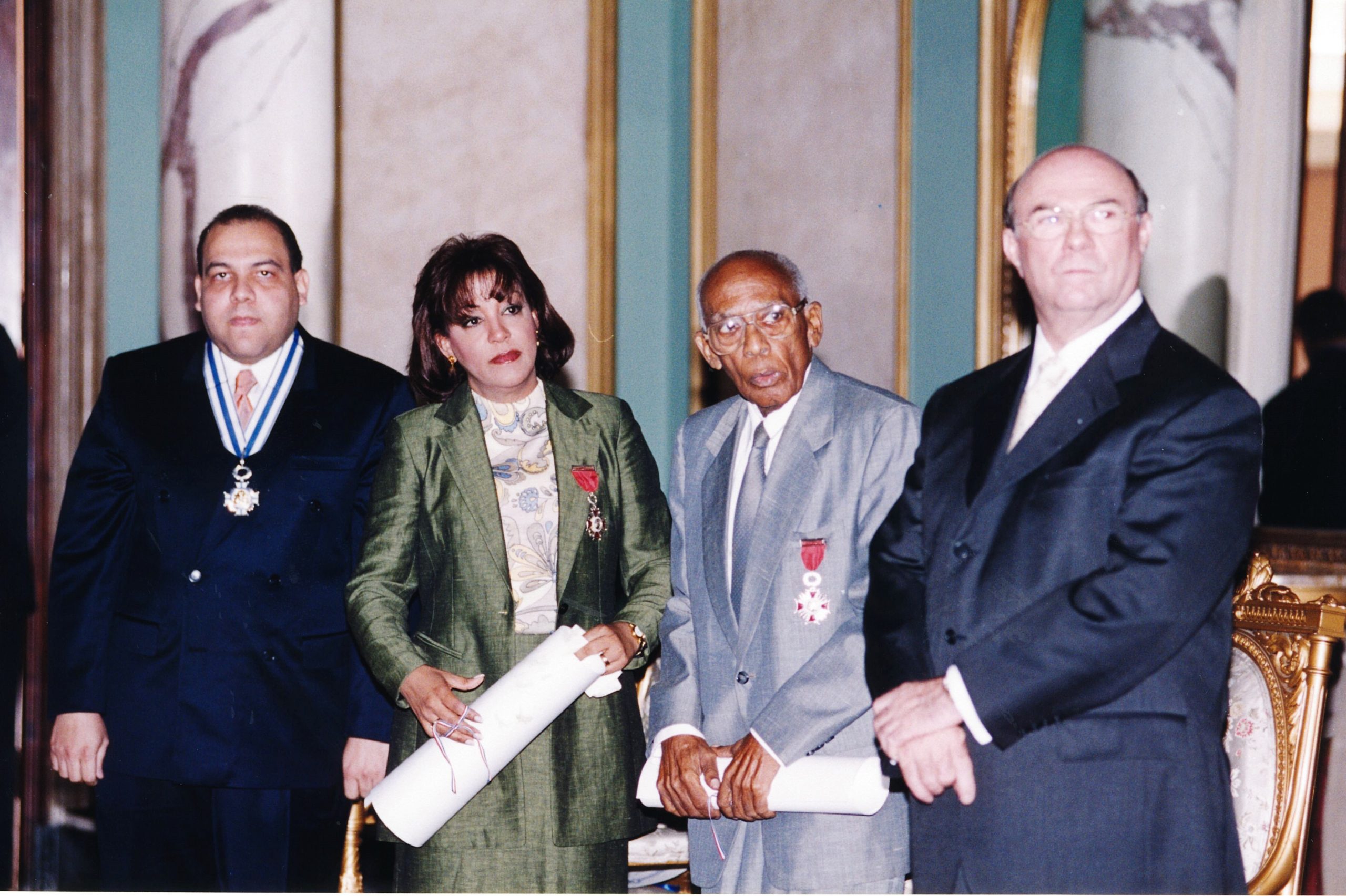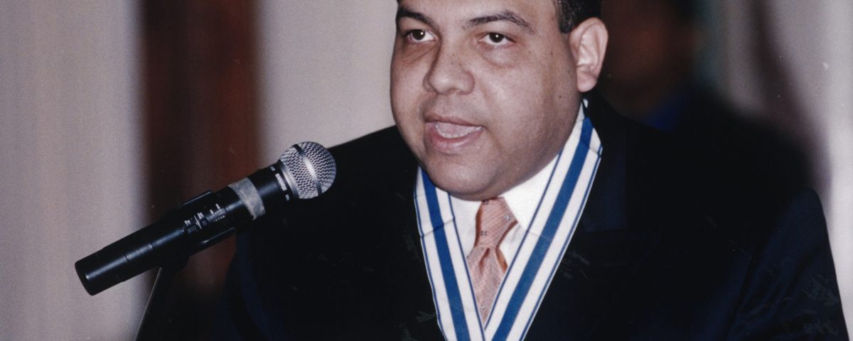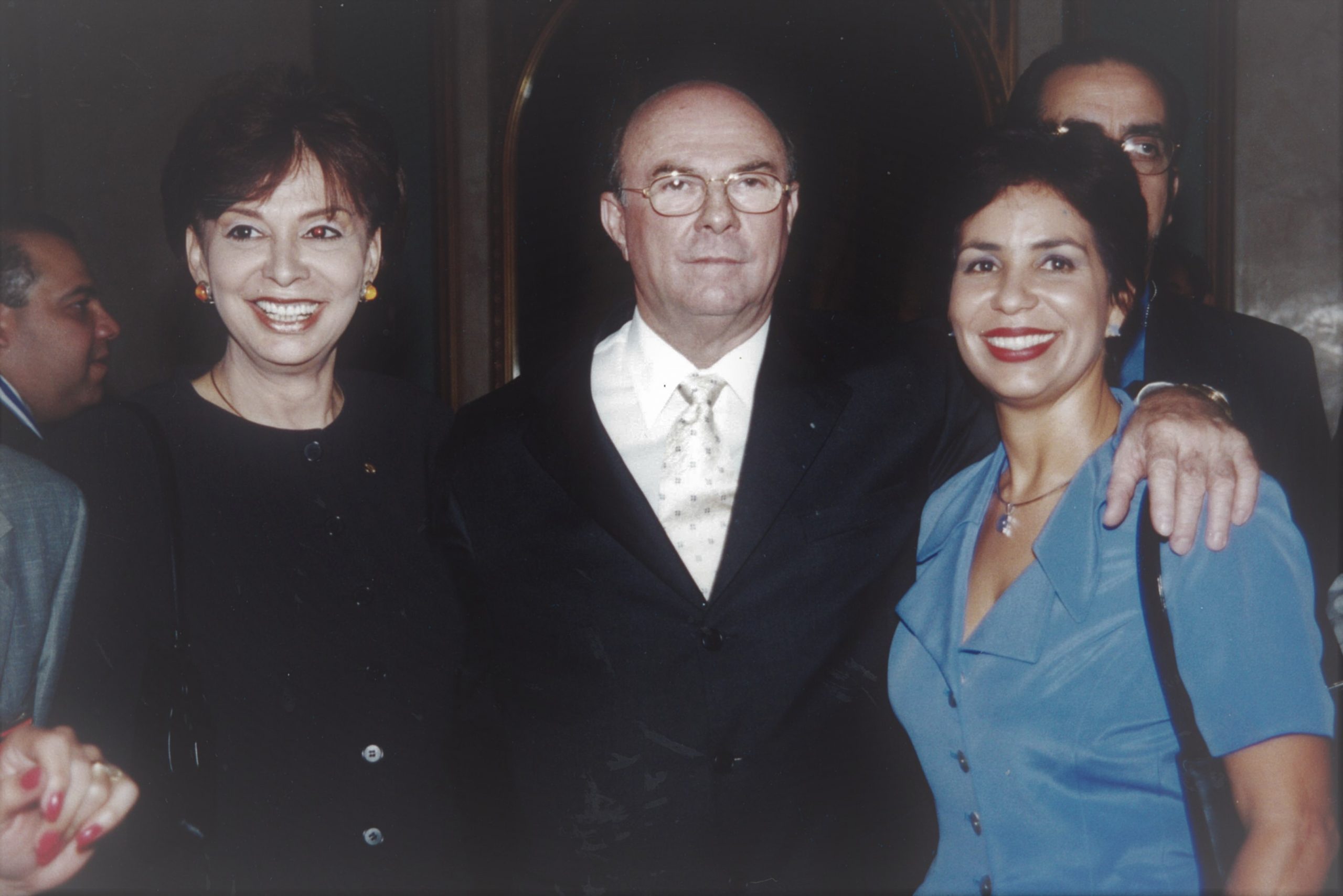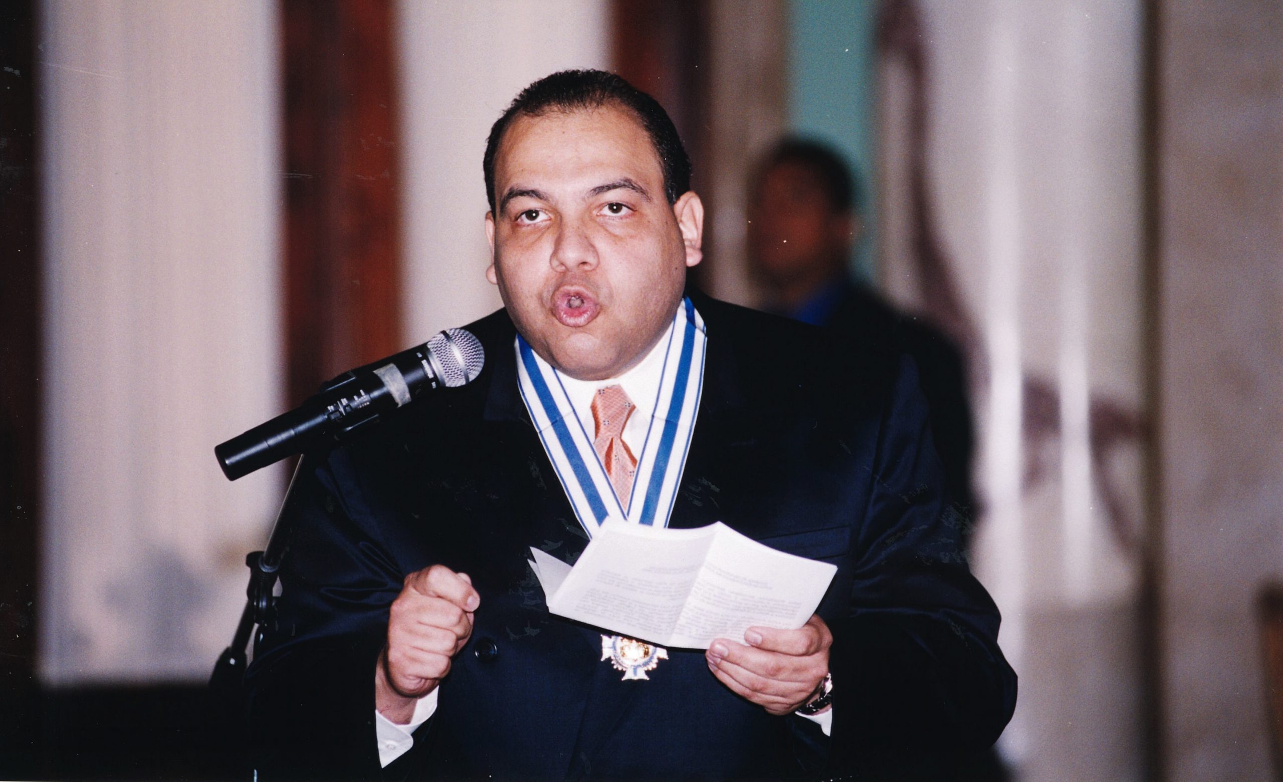 Momento de la condecoración: Miguel Reyes Sánchez, el Presidente Hipólito Mejía Y Carlos Guzmán, Jefe de Protocolo