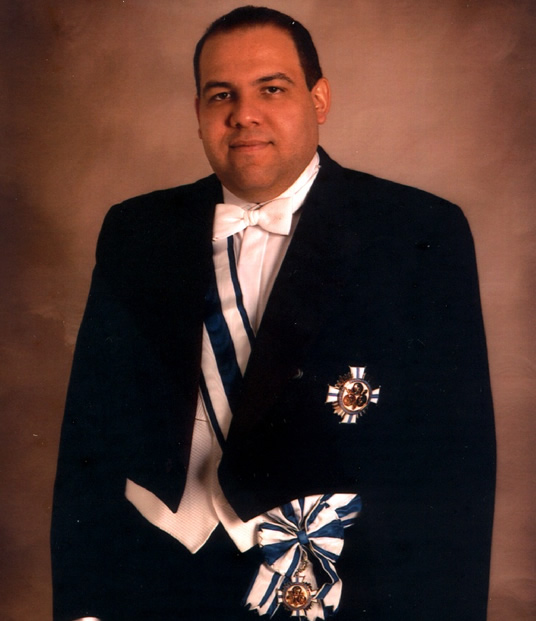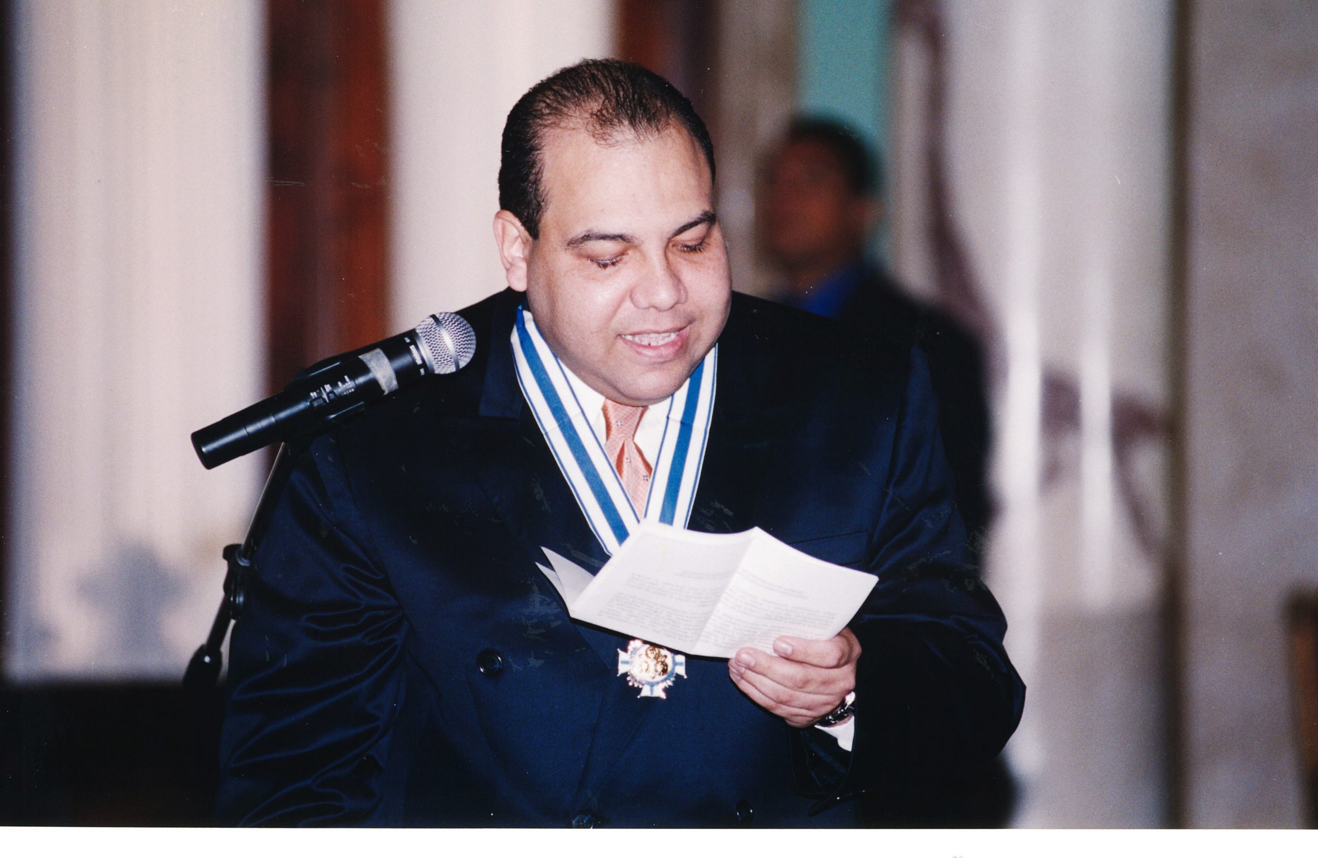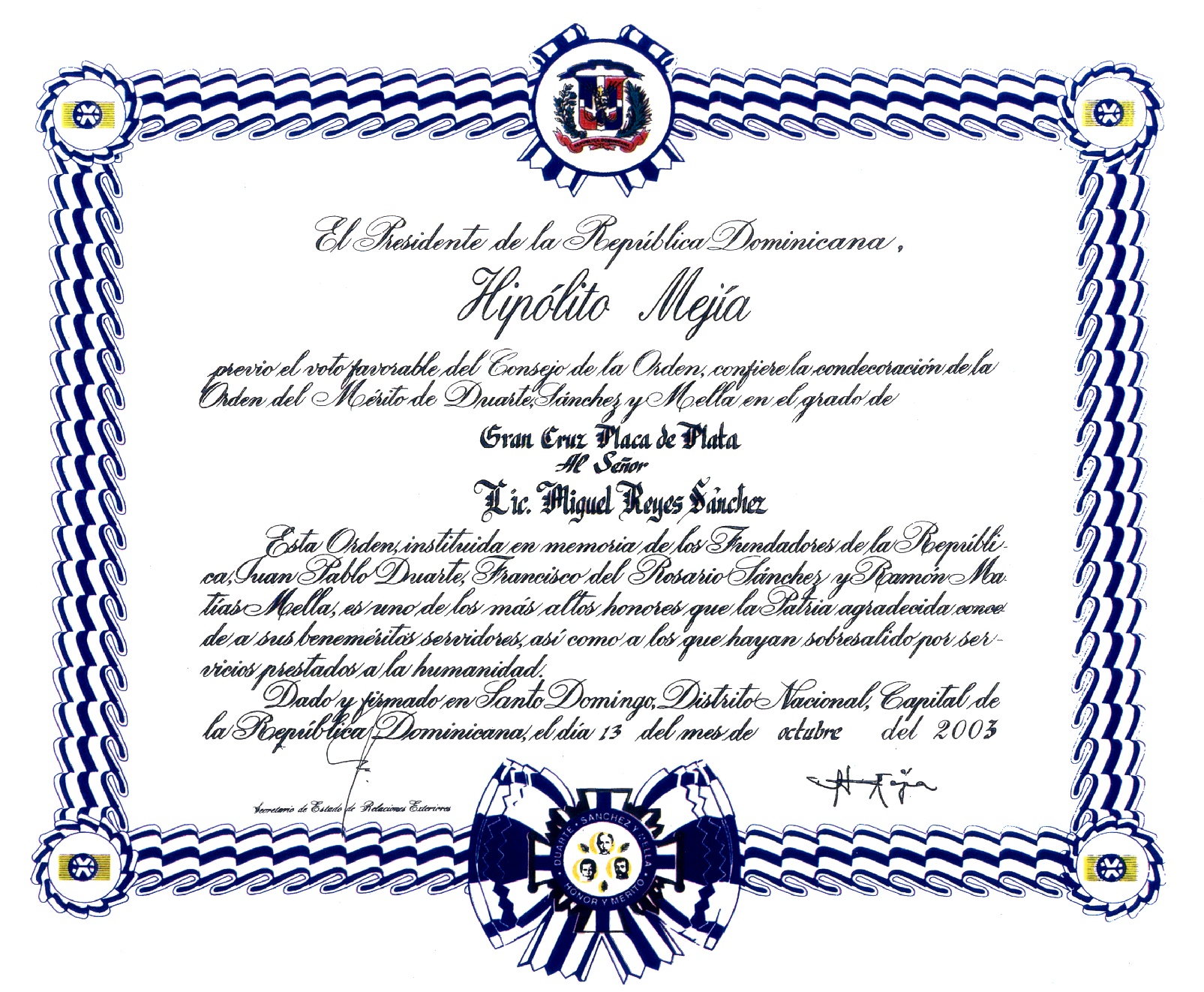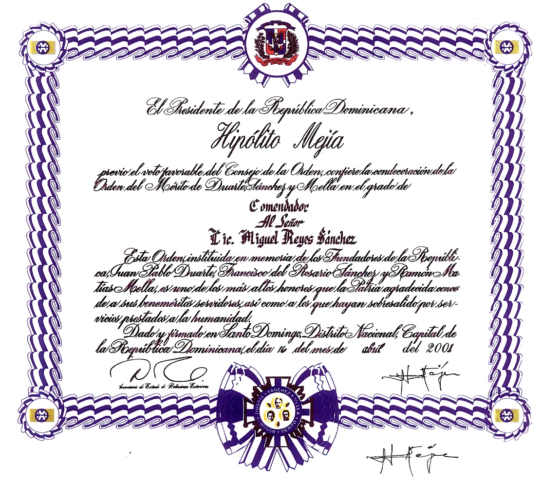 El embajador Miguel Reyes Sánchez ostentando la Condecoración de la Orden al Mérito de Duarte, Sánchez y Mella, en el Grado de Gran Cruz Plata de Plata.
